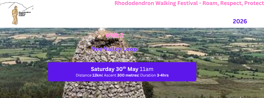 Check in Clogheen Community Centre. Bus will transfer participants to walk start point. Right from the off the trails are adorned with rhododendrons in full bloom walking along the National Waymarked Trails of the Tipperary Heritage Way and East Munster Way. The trails goes deep into Kilballyboy Woods, then under the renowned beauty spot The Vee before ascending upto the iconic hairpin bend where the views of the valley get better and better the further the trail goes. The trail continues along mountain paths towards Grubbs Monument to give even better views of the valley below. The trail then makes its way across the valley to Bay Lough surrounded in a canopy of rhododendrons. Follow another National Waymarked Trail, the Blackwater Way back to Clogheen along rhododendron lined trails.